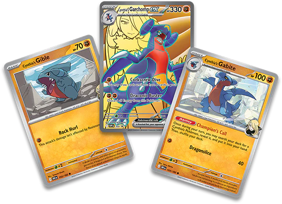 - 2 cartas holográficas de Gible y Gabite de Cynthia, representando las etapas evolutivas de Garchomp.